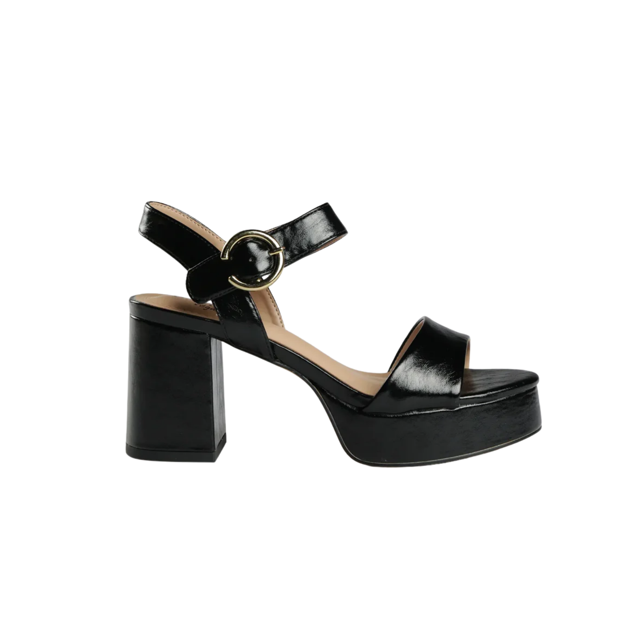 סנדלי פלטפורמה במראה זוהר עם רצועת פלה קלאסית ועקב רחב ליציבות מושלמת. עשויים דמוי עור איכותי בגימור מטאלי יוקרתי, עם אבזם עגול להשלמת הסטייל. שילוב מנצח של נוחות ואלגנטיות, מושלם להוספת גובה ושיק לכל הופעה.