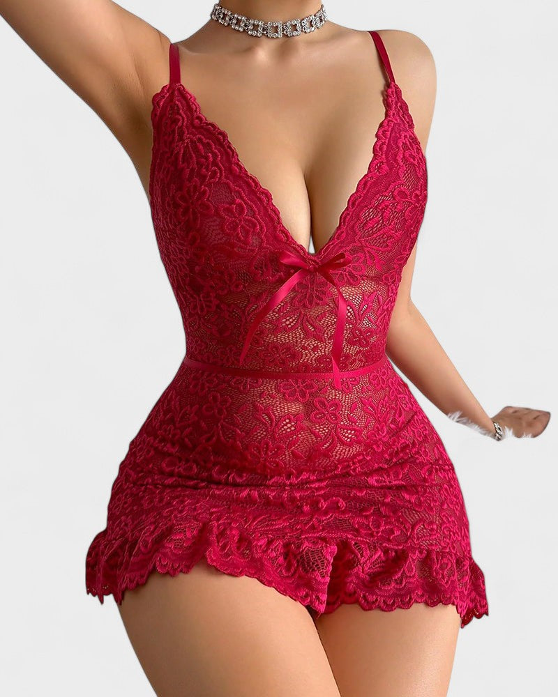שמלונת אלגנטית, שתופסת את העין עם תחרה עדינה בדוגמת פרחים וגזרה חושנית. מחשוף עמוק עם קשת דיסקרטית מדגיש את המחשוף, בעוד שהמותן האלסטית מדגישה את הקימורים. שולי השמלה עם קישוטים נותנים לדגם נופך רומנטי ומשחקי. בחירה מושלמת לערבים אינטימיים וגם לרגעים שבהם את רוצה להרגיש בטוחה ואטרקטיבית.